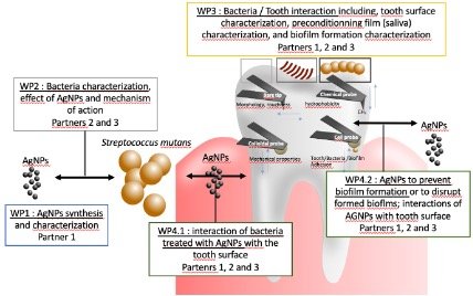 This project studies the action of silver nanoparticles in inhibiting biofilm formation on inorganic surfaces during the caries-originating process, and on surface colonization by antibiotic-resistant bacteria that cause hospital-acquired infections. In situ techniques based on atomic force microscopy will be used, and methodologies will be developed for determining quantitative parameters of bacterial/substrate and nanoparticle/bacterial adhesion.